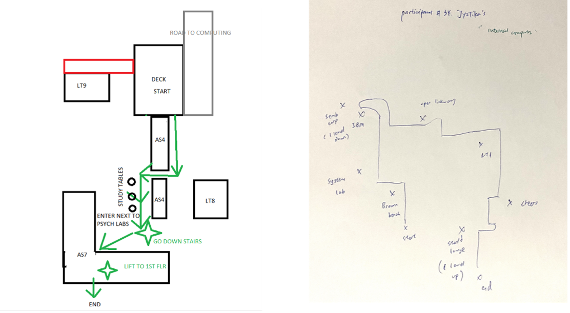In our experiment, participants were taken on route (10 minutes multilevel route), which was unfamiliar to them, and after that they were asked to perform a variety of wayfinding (e.g., shortcut) and spatial updating tasks. They were also asked to sketch a map of the route.